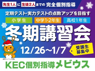 | 料金 | 初めてKEC個別指導メビウスの授業を受けられる方限定 小3~中2:1セット(4回) 無料、2セット(8回)6,050円、3セット(12回)12,100円(テキスト代1科目につき1,400円) 高1:1セット(4回)無料、2セット(8回)18,700円、3セット(12回)36,300円(テキスト代1科目につき1,400円) ※中3は別途ご相談ください。 |